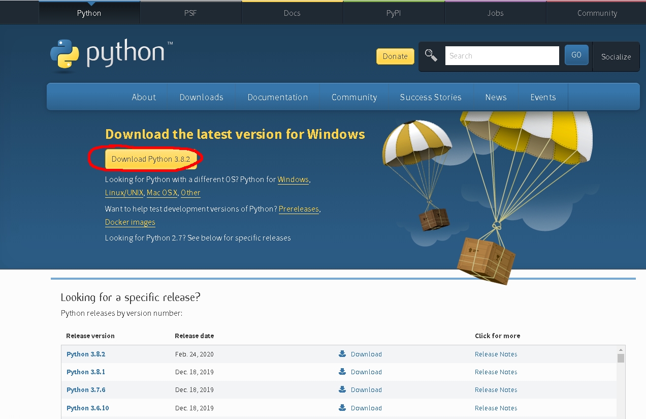 Download the latest version for Windows -> Download Python 3.8.2 (3.8.2 -> 최신버전에 따라 변동됨) 클릭후 설치